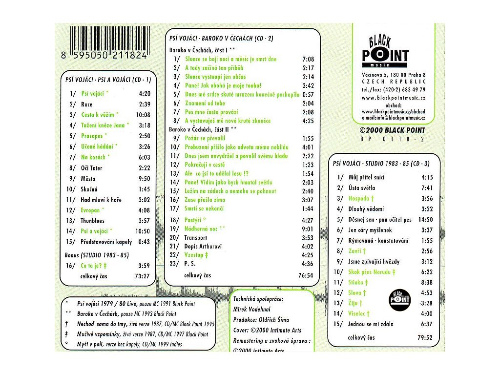 The tripple CD presents three oldest programmes of Psí vojáci. The dark and mystical Psi a vojáci (Dogs and Soldiers), the dreary and unbalanced Baroko v Čechách (Baroque in Bohemia) - both with lyrics of Jáchym Topol) - and the record from 1985 presenting the band with the new repertoire and with the above mentioned new lyrics.